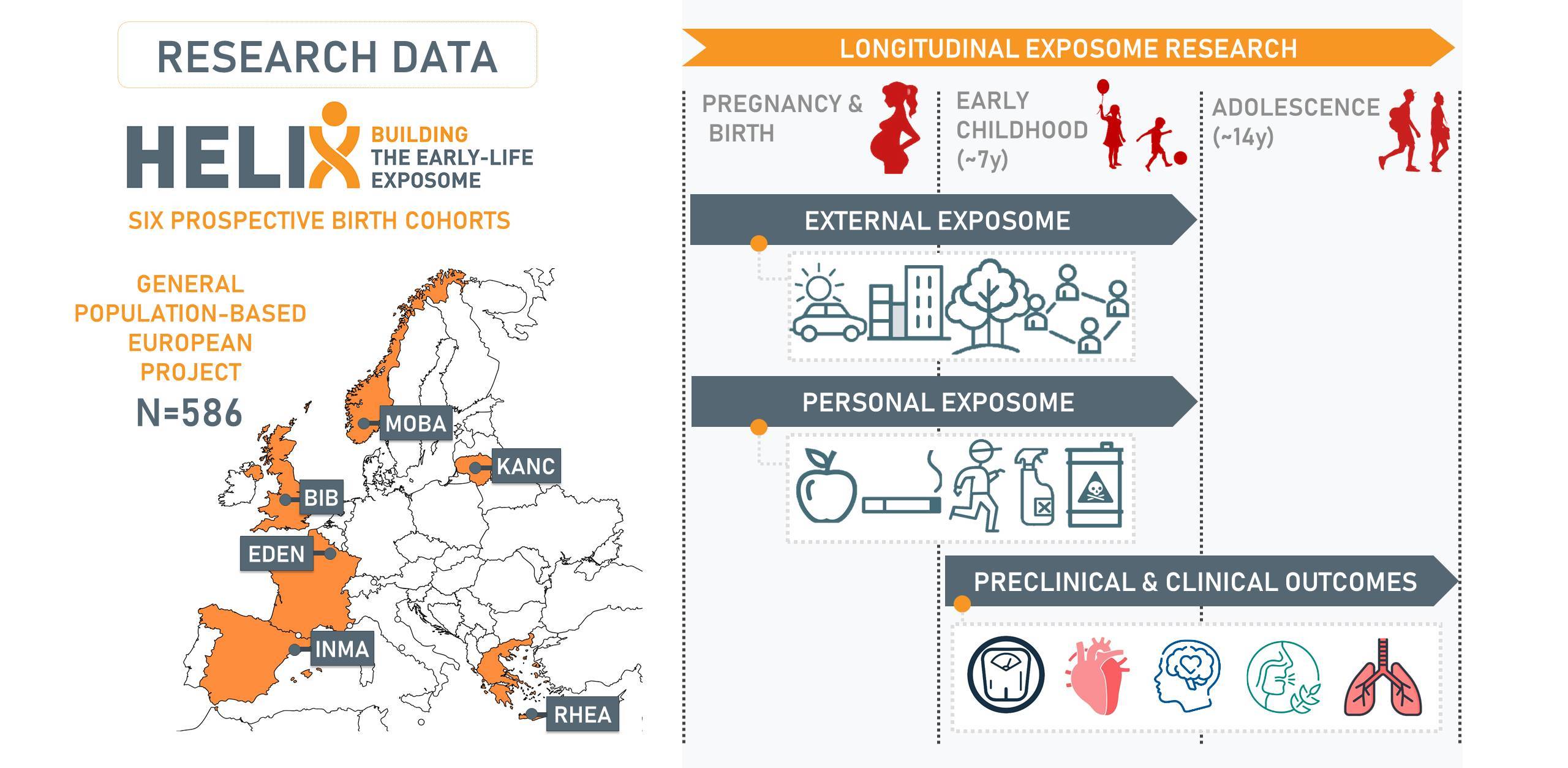 The study investigated 11 preclinical and clinical health outcomes in four key health areas linked to non-communicable disease risk and prevalent among European children. These outcomes were assessed consistently during childhood and adolescence, enabling a longitudinal analysis of exposome-health associations across 22 outcome variables. The health domains studied were:
